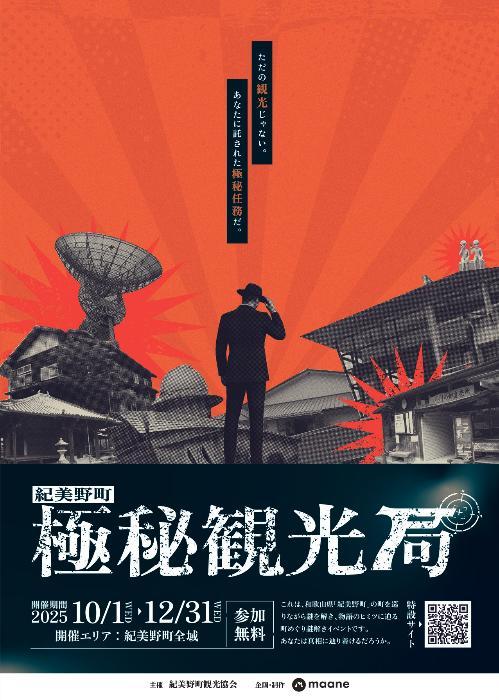 紀美野町観光協会では、町歩きと物語体験を融合した町めぐり謎解きイベント『紀美野町極秘観光局』を2025年10月1日より開始します。参加者は“極秘任務”に挑む調査協力者として、町のあちこちに潜む手がかりを読み解き、真相へと迫ります。スマートフォン連動の指令を受け取りながら進行するため、謎解きが初めての方やご家族、友人同士でも気軽に楽しめる設計です。