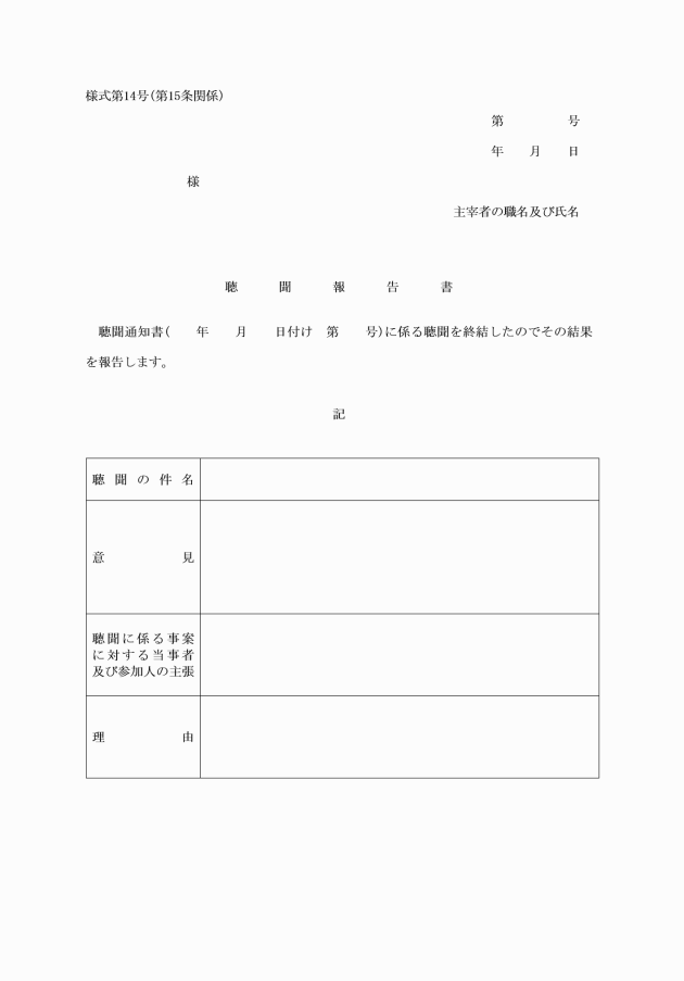 第15条 法第24条第1項に規定する調書は、聴聞調書(様式第13号)により作成し、主宰者がこれに記名しなければならない。