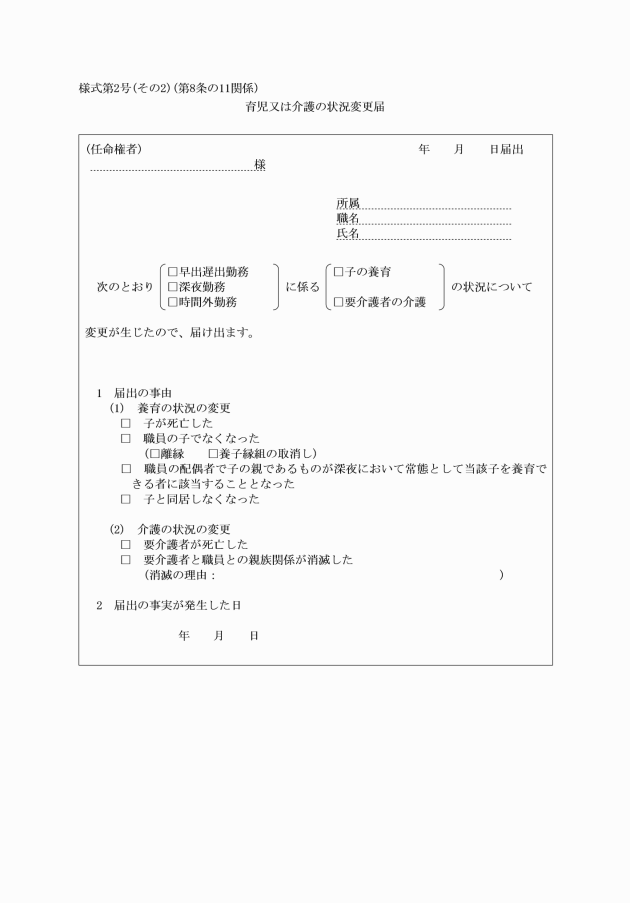 第8条の4 条例第8条の2第1項の規定による請求(以下「深夜勤務制限の請求」という。)は、深夜勤務制限請求書(様式第2号)により、深夜における勤務の制限を請求する一の期間(6箇月以内の期間に限る。)について、その初日(以下「深夜勤務制限開始日」という。)及び末日(以下「深夜勤務制限終了日」という。)とする日を明らかにして、任命権者に対し、深夜勤務制限開始日の1箇月前までにしなければならない。