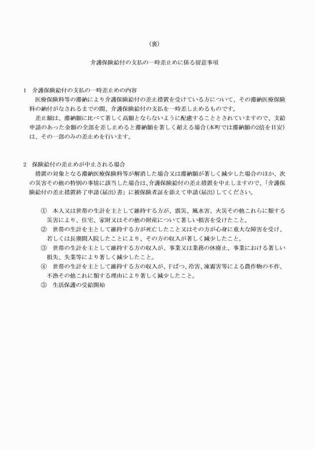 第6条 町長は、法第67条に規定する保険給付の支払の一時差止め(以下この章において単に「差止め」という。)を次の基準により行う。