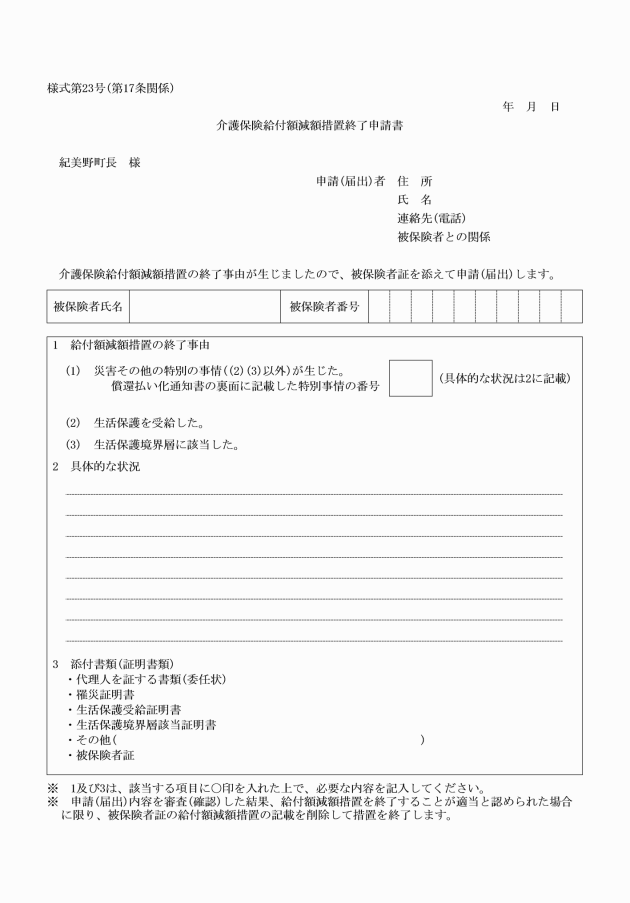 第17条 法第69条第1項の規定により給付額減額等が行われた後に政令第35条に規定する事情が生じたため、給付額減額等の記載の消除を受けようとする者は、介護保険給付額減額措置終了申請書(様式第23号)に証拠書類及び被保険者証を添えて町長に申請しなければならない。