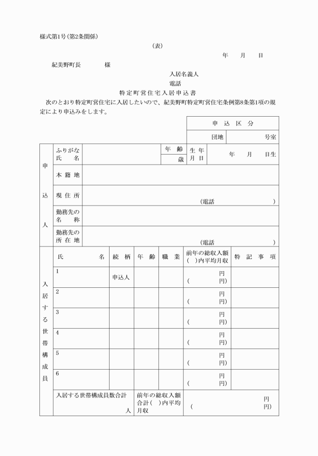 第9条 入居者は、出生、死亡又は転出により入居者と同一の世帯に属する者が異動したときは、速やかに、特定町営住宅世帯員異動届出書(様式第10号)を町長に提出しなければならない。
