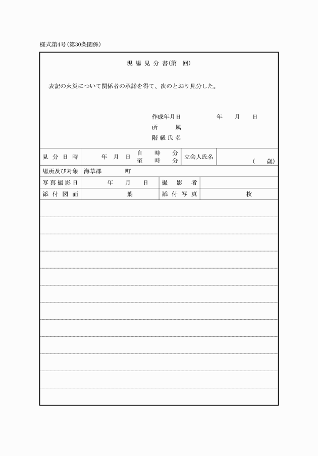 4 署長は、震災に伴う火災の調査書類は、別に定める基準及び作成要領によって添付書類の一部や記載内容の一部を省略し、作成することができる。ただし、震災時における地域住民等からの聞き込み調査にあっては震災聞き込み調査書(様式第41号)を用いるものとする。